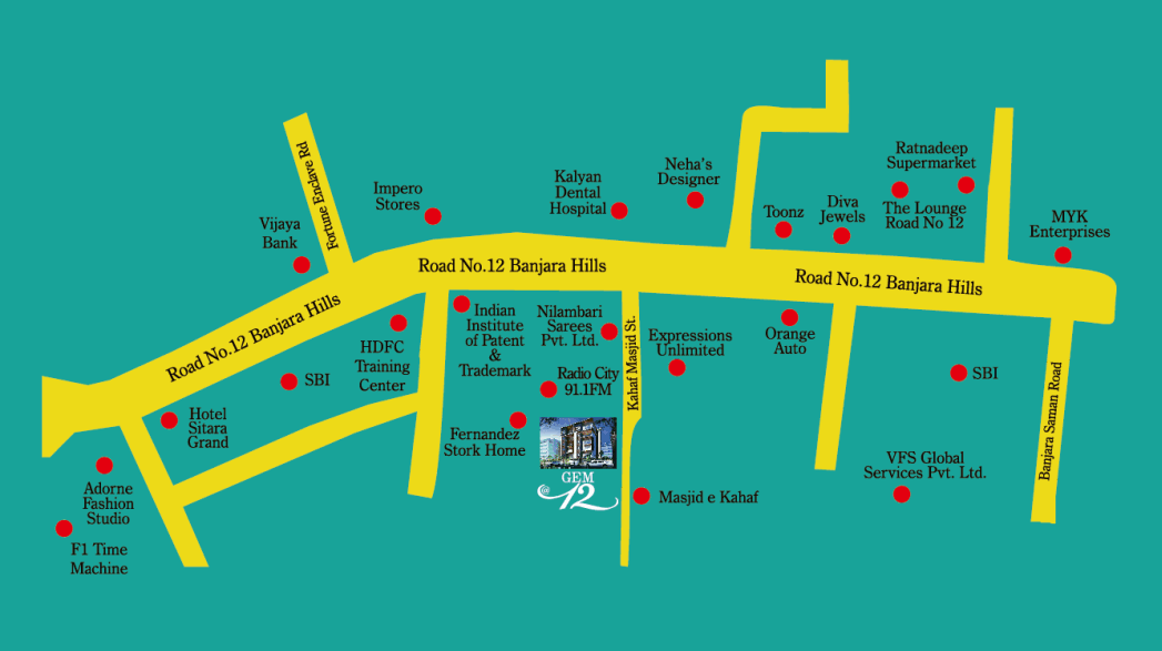 GEM @ 12, located right in the heart of the city, on Road No 12, Banjara Hills, is a stunningly beautiful avant-garde, semi luxurious residential complex. Displaying wonderful professional finesse. GEM Builders and Developers, have presented to the residents of modern hyderabad one more example of their expertise and almost three decades experience in the field of construction of finest residential and commercial complexes.
